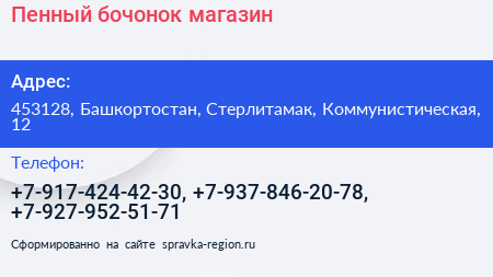 Пенный бочонок, магазин по адресу 453128, Башкортостан, Стерлитамак, Коммунистическая, 12 в дальнейшем Организация, размещена в следующих категориях: