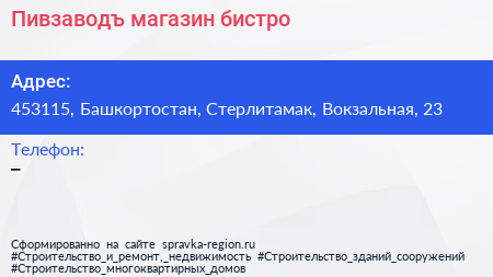 Пивзаводъ, магазин-бистро по адресу 453115, Башкортостан, Стерлитамак, Вокзальная, 23 в дальнейшем Организация, размещена в следующих категориях: