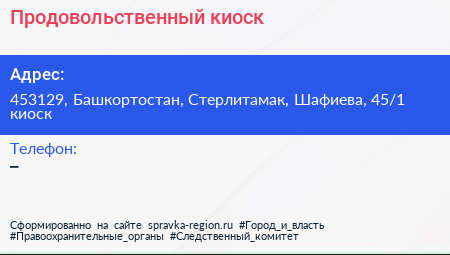 Продовольственный киоск по адресу 453129, Башкортостан, Стерлитамак, Шафиева, 45/1 киоск в дальнейшем Организация, размещена в следующих категориях: