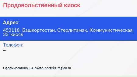 Продовольственный киоск по адресу 453118, Башкортостан, Стерлитамак, Коммунистическая, 33 киоск в дальнейшем Организация, размещена в следующих категориях:
