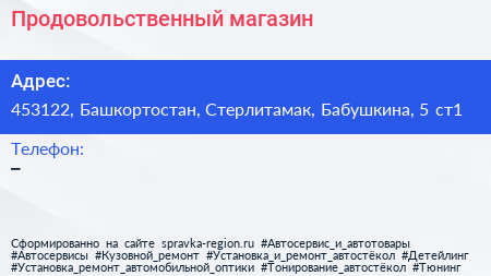 Продовольственный магазин по адресу 453122, Башкортостан, Стерлитамак, Бабушкина, 5 ст1 в дальнейшем Организация, размещена в следующих категориях: