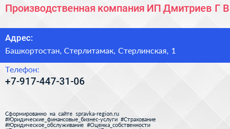 Производственная компания, ИП Дмитриев Г.В. по адресу Башкортостан, Стерлитамак, Стерлинская, 1 в дальнейшем Организация, размещена в следующих категориях: