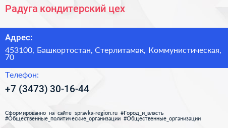 Радуга, кондитерский цех по адресу 453100, Башкортостан, Стерлитамак, Коммунистическая, 70 в дальнейшем Организация, размещена в следующих категориях: