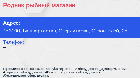 Родник, рыбный магазин по адресу 453100, Башкортостан, Стерлитамак, Строителей, 26 в дальнейшем Организация, размещена в следующих категориях: