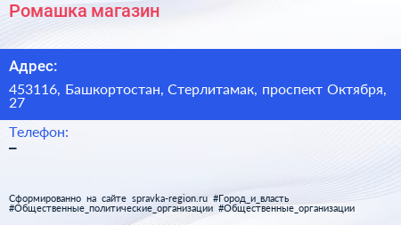 Ромашка, магазин по адресу 453116, Башкортостан, Стерлитамак, проспект Октября, 27 в дальнейшем Организация, размещена в следующих категориях: