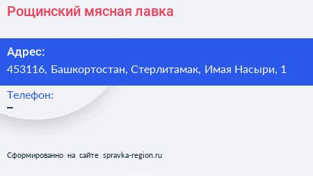 Рощинский, мясная лавка по адресу 453116, Башкортостан, Стерлитамак, Имая Насыри, 1 в дальнейшем Организация, размещена в следующих категориях: