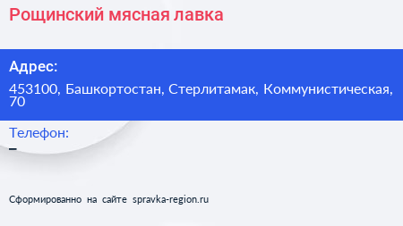 Рощинский, мясная лавка по адресу 453100, Башкортостан, Стерлитамак, Коммунистическая, 70 в дальнейшем Организация, размещена в следующих категориях: