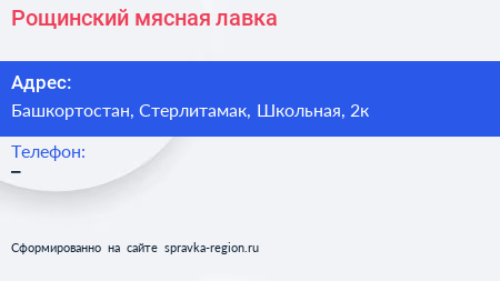 Рощинский, мясная лавка по адресу Башкортостан, Стерлитамак, Школьная, 2к в дальнейшем Организация, размещена в следующих категориях: