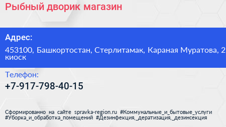 Рыбный дворик, магазин по адресу 453100, Башкортостан, Стерлитамак, Караная Муратова, 2 киоск в дальнейшем Организация, размещена в следующих категориях: