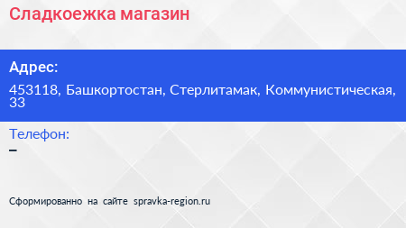 Сладкоежка, магазин по адресу 453118, Башкортостан, Стерлитамак, Коммунистическая, 33 в дальнейшем Организация, размещена в следующих категориях: