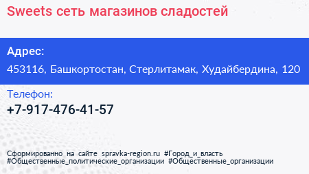 Sweets, сеть магазинов сладостей по адресу 453116, Башкортостан, Стерлитамак, Худайбердина, 120 в дальнейшем Организация, размещена в следующих категориях:
