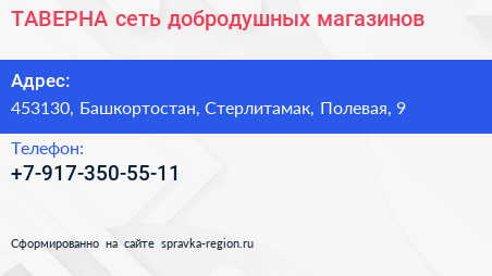 ТАВЕРНА, сеть добродушных магазинов по адресу 453130, Башкортостан, Стерлитамак, Полевая, 9 в дальнейшем Организация, размещена в следующих категориях: