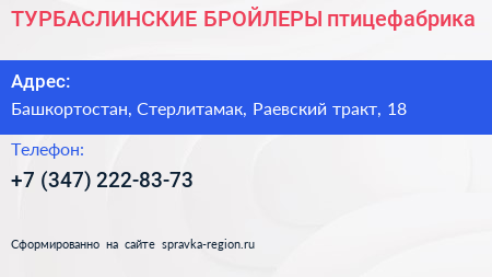 ТУРБАСЛИНСКИЕ БРОЙЛЕРЫ, птицефабрика по адресу Башкортостан, Стерлитамак, Раевский тракт, 18 в дальнейшем Организация, размещена в следующих категориях: