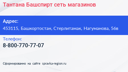 Тантана-Башспирт, сеть магазинов по адресу 453115, Башкортостан, Стерлитамак, Нагуманова, 56в в дальнейшем Организация, размещена в следующих категориях: