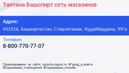Тантана-Башспирт, сеть магазинов по адресу 453116, Башкортостан, Стерлитамак, Худайбердина, 99/а в дальнейшем Организация, размещена в следующих категориях: