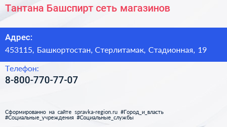 Тантана-Башспирт, сеть магазинов по адресу 453115, Башкортостан, Стерлитамак, Стадионная, 19 в дальнейшем Организация, размещена в следующих категориях: