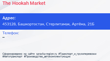 The Hookah Market по адресу 453128, Башкортостан, Стерлитамак, Артёма, 21Б в дальнейшем Организация, размещена в следующих категориях: