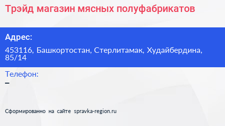Трэйд, магазин мясных полуфабрикатов по адресу 453116, Башкортостан, Стерлитамак, Худайбердина, 85/14 в дальнейшем Организация, размещена в следующих категориях: