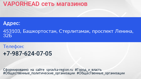 VAPORHEAD, сеть магазинов по адресу 453103, Башкортостан, Стерлитамак, проспект Ленина, 32Б в дальнейшем Организация, размещена в следующих категориях:
