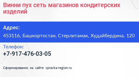 Винни пух, сеть магазинов кондитерских изделий по адресу 453116, Башкортостан, Стерлитамак, Худайбердина, 120 в дальнейшем Организация, размещена в следующих категориях:
