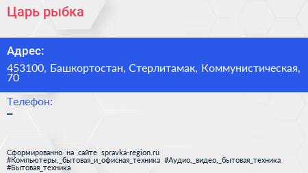 Царь рыбка по адресу 453100, Башкортостан, Стерлитамак, Коммунистическая, 70 в дальнейшем Организация, размещена в следующих категориях: