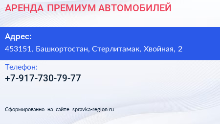 АРЕНДА ПРЕМИУМ АВТОМОБИЛЕЙ по адресу 453151, Башкортостан, Стерлитамак, Хвойная, 2 в дальнейшем Организация, размещена в следующих категориях: