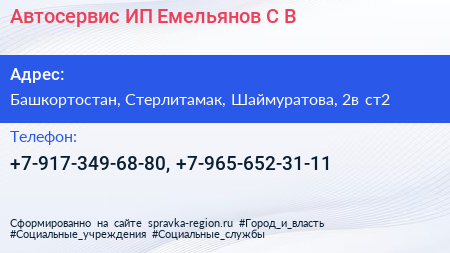 Автосервис, ИП Емельянов С.В. по адресу Башкортостан, Стерлитамак, Шаймуратова, 2в ст2 в дальнейшем Организация, размещена в следующих категориях: