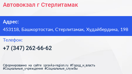 Автовокзал, г. Стерлитамак по адресу 453118, Башкортостан, Стерлитамак, Худайбердина, 198 в дальнейшем Организация, размещена в следующих категориях: