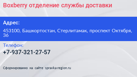 Boxberry, отделение службы доставки по адресу 453100, Башкортостан, Стерлитамак, проспект Октября, 36 в дальнейшем Организация, размещена в следующих категориях: