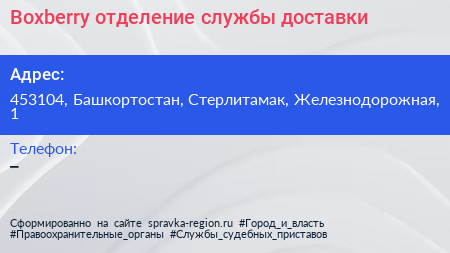 Boxberry, отделение службы доставки по адресу 453104, Башкортостан, Стерлитамак, Железнодорожная, 1 в дальнейшем Организация, размещена в следующих категориях:
