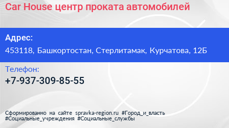 Car House, центр проката автомобилей по адресу 453118, Башкортостан, Стерлитамак, Курчатова, 12Б в дальнейшем Организация, размещена в следующих категориях: