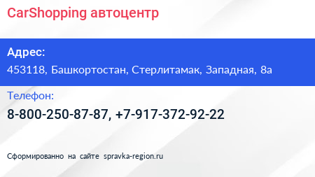 CarShopping, автоцентр по адресу 453118, Башкортостан, Стерлитамак, Западная, 8а в дальнейшем Организация, размещена в следующих категориях: