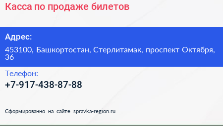 Касса по продаже билетов по адресу 453100, Башкортостан, Стерлитамак, проспект Октября, 36 в дальнейшем Организация, размещена в следующих категориях: