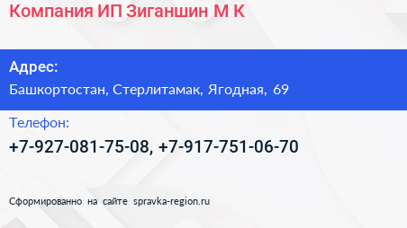 Компания, ИП Зиганшин М.К. по адресу Башкортостан, Стерлитамак, Ягодная, 69 в дальнейшем Организация, размещена в следующих категориях: