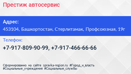 Престиж, автосервис по адресу 453104, Башкортостан, Стерлитамак, Профсоюзная, 19г в дальнейшем Организация, размещена в следующих категориях: