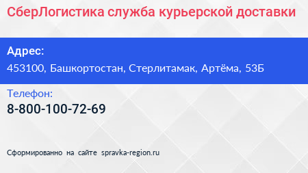 СберЛогистика, служба курьерской доставки по адресу 453100, Башкортостан, Стерлитамак, Артёма, 53Б в дальнейшем Организация, размещена в следующих категориях: