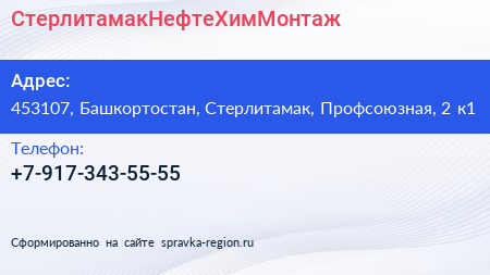 СтерлитамакНефтеХимМонтаж по адресу 453107, Башкортостан, Стерлитамак, Профсоюзная, 2 к1 в дальнейшем Организация, размещена в следующих категориях:
