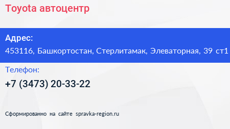 Toyota, автоцентр по адресу 453116, Башкортостан, Стерлитамак, Элеваторная, 39 ст1 в дальнейшем Организация, размещена в следующих категориях: