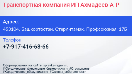 Транспортная компания, ИП Ахмадеев А.Р. по адресу 453104, Башкортостан, Стерлитамак, Профсоюзная, 17Б в дальнейшем Организация, размещена в следующих категориях: