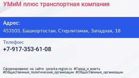 УМиМ плюс, транспортная компания по адресу 453103, Башкортостан, Стерлитамак, Западная, 18 в дальнейшем Организация, размещена в следующих категориях: