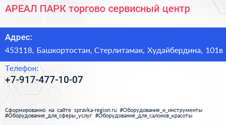 АРЕАЛ ПАРК, торгово-сервисный центр по адресу 453118, Башкортостан, Стерлитамак, Худайбердина, 101в в дальнейшем Организация, размещена в следующих категориях: