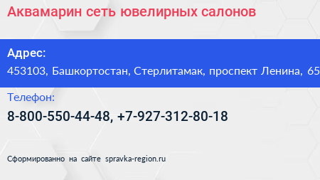 Аквамарин, сеть ювелирных салонов по адресу 453103, Башкортостан, Стерлитамак, проспект Ленина, 65 в дальнейшем Организация, размещена в следующих категориях: