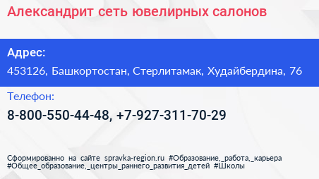 Александрит, сеть ювелирных салонов по адресу 453126, Башкортостан, Стерлитамак, Худайбердина, 76 в дальнейшем Организация, размещена в следующих категориях: