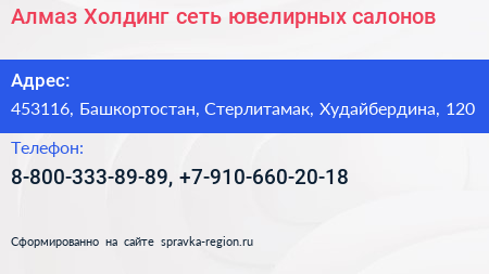 Алмаз-Холдинг, сеть ювелирных салонов по адресу 453116, Башкортостан, Стерлитамак, Худайбердина, 120 в дальнейшем Организация, размещена в следующих категориях: