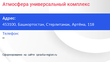Атмосфера, универсальный комплекс по адресу 453100, Башкортостан, Стерлитамак, Артёма, 118 в дальнейшем Организация, размещена в следующих категориях: