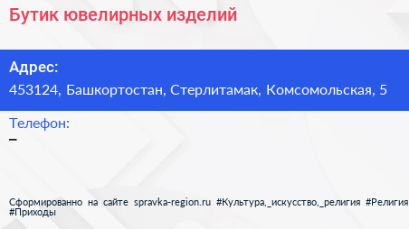 Бутик ювелирных изделий по адресу 453124, Башкортостан, Стерлитамак, Комсомольская, 5 в дальнейшем Организация, размещена в следующих категориях:
