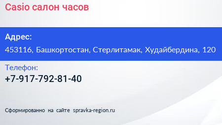 Casio, салон часов по адресу 453116, Башкортостан, Стерлитамак, Худайбердина, 120 в дальнейшем Организация, размещена в следующих категориях: