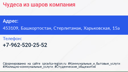 Чудеса из шаров, компания по адресу 453109, Башкортостан, Стерлитамак, Харьковская, 15а в дальнейшем Организация, размещена в следующих категориях: