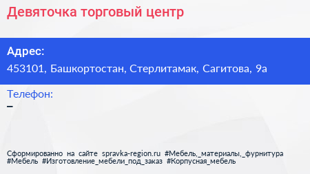 Девяточка, торговый центр по адресу 453101, Башкортостан, Стерлитамак, Сагитова, 9а в дальнейшем Организация, размещена в следующих категориях: