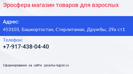 Эросфера, магазин товаров для взрослых по адресу 453103, Башкортостан, Стерлитамак, Дружбы, 29а ст1 в дальнейшем Организация, размещена в следующих категориях:
